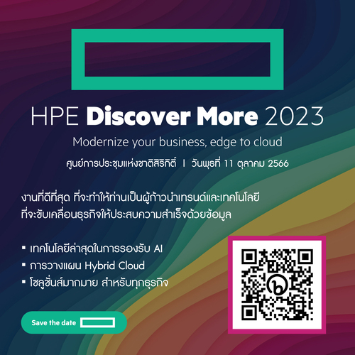 โดยงาน HPE Discover More 2023 จะจัดขึ้นในวันพุธที่ 11 ตุลาคม 2566 ณ ศูนย์การประชุมแห่งชาติสิริกิต์ ห้อง Ballroom 1-3 ชั้น 1 เริ่มตั้งแต่เวลา 08.30 -18.00 น.