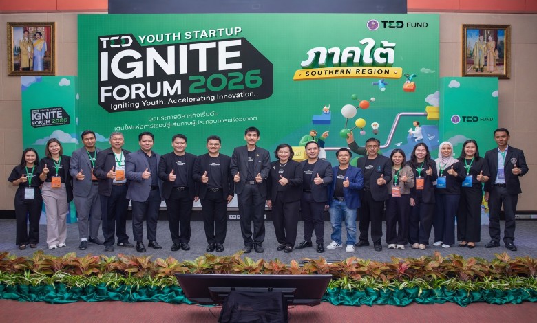 น.สพ.ดร.สนัด วงศ์ทวีทอง (ที่ 8 จากซ้าย) ผู้จัดการกองทุนพัฒนาผู้ประกอบการเทคโนโลยีและนวัตกรรม (TED Fund) และคณะกรรมการ นางสุวิภา วรรณสาธพ (กลาง) นายนพนันท์ สุวรรณจตุพร (ที่ 8 จากขวา) และ นายปกรณ์ ปรีชาวุฒิเดช (ที่ 7 จากซ้าย) พร้อมด้วยหน่วยงานพันธมิตรที่ร่วมสนับสนุนโครงการ ร่วมจัดงาน TED Youth Startup – IGNITE Forum 2026 Road Show ภาคใต้ ภายใต้โครงการ TED Fund Road ที่จังหวัดนครศรีธรรมราช และแสดงความยินดีกับทีมผู้ชนะเลิศ TED Youth Startup-IGNITE Forum 2026 รอบคัดเลือกภาคใต้ ณ ห้องประชุมศรีธรรมราช อาคารสถาปัตยกรรมและการออกแบบ มหาวิทยาลัยวลัยลักษณ์ จ. นครศรีธรรมราช เมื่อเร็ว ๆ นี้