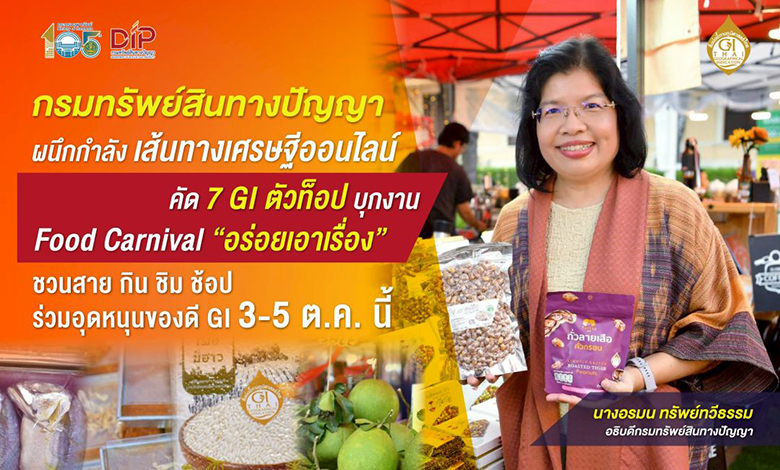 นางอรมน กล่าวว่า เพื่อเป็นการเสริมแกร่งผู้ประกอบการไทย ผ่านการสร้างมูลค่าเพิ่มสินค้า GIตามแนวนโยบาย Quick Big Win ของรัฐมนตรีว่าการกระทรวงพาณิชย์ (นางศุภจี สุธรรมพันธุ์) กรมทรัพย์สิน ทางปัญญาจึงวางแนวทางบูรณาการความร่วมมือกับหน่วยงานต่างๆ ทั้งภาครัฐและเอกชน เพื่อร่วมกันต่อยอด สร้างมูลค่าและขยายโอกาสทางการค้าให้กับสินค้า GI ไทย โดยเปิดตัวกิจกรรมแรกของปีงบประมาณ พ.ศ. 2569ในงาน Food Carnival “อร่อยเอาเรื่อง” ซึ่งเป็นความร่วมมือระหว่างกรมทรัพย์สินทางปัญญาและสื่อออนไลน์ “เส้นทางเศรษฐี” ที่ต้องการส่งเสริมอาชีพของ SMEs ไทย จึงร่วมนำสินค้า GI ไทย 7 รายการ มาจัดจำหน่ายในงานนี้โดยการจัดงาน Food Carnival “อร่อยเอาเรื่อง” ถือเป็นมหกรรมอาหารที่รวบรวมร้านอาหารอร่อยระดับตำนาน อาหารไทยโบราณหาทานยาก อาหารนานาชาติเลิศรส ขนมหวานสูตรต้นตำรับสุดคลาสสิกเมนูสร้างสรรค์ร่วมสมัยจากเชฟชื่อดัง และสุดยอดสินค้า GI จากจังหวัดต่างๆ มารวมไว้ในงานเดียว ทั้งหมูย่างเมืองตรัง ขนมหม้อแกงเมืองเพชร (เพชรบุรี) ปลาทูแม่กลอง (สมุทรสงคราม) ส้มโอขาวใหญ่สมุทรสงครามมะพร้าวน้ำหอมบ้านแพ้ว (สมุทรสาคร) ถั่วลายเสือแม่ฮ่องสอน และข้าวเหนียวเขาวงกาฬสินธุ์ เพื่อให้นักชิม นักช้อป ได้สัมผัสคุณภาพความอร่อยของสินค้า GI ไทย นอกจากนี้ ภายในงานยังเป็นการรวมตัวกันของเหล่าอินฟลูเอนเซอร์ด้านอาหารชื่อดัง อาทิ เฮียจก โต๊ะเดียว เชฟอาหารจีนระดับตำนาน เชฟเบลล์ แชมป์รายการ The Restaurant War Thailand ซีซั่น 2 เชฟแมน ผู้ก่อตั้งร้าน Chef Man และผู้แข่งขันรายการเชฟกระทะเหล็กประเทศไทย ฯลฯ ที่จะมาร่วมพิสูจน์ความอร่อยของอาหารเมนูต่างๆ พร้อมด้วยกิจกรรมเสวนาและ Workshop สนุกๆ อีกมากมาย ในโอกาสนี้ กรมทรัพย์สินทางปัญญาจึงขอเชิญชวนทุกท่านมาร่วมสนับสนุนเกษตรกร ผู้ประกอบการ GI รวมถึงร้านค้าต่างๆ ได้ตลอด 3 วันเต็ม ตั้งแต่วันที่ 3 - 5 ตุลาคม 2568 นี้ ที่มิวเซียมสยาม