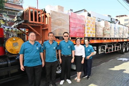 ผู้จัดการใหญ่ฯ เป็นตัวแทน พร้อมคณะผู้บริหาร พนักงาน และอาสาสมัครช่วยกันลำเลียงเครื่องอุปโภคบริโภคและสิ่งของเครื่องใช้จำเป็นต่างๆ ที่ได้รับมอบจากสมาคมวิเทศพาณิชย์ไทย-จีน