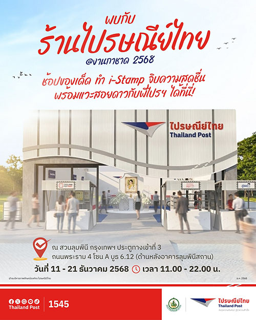พบกันที่ร้านไปรษณีย์ในงานกาชาด และร่วมกิจกรรมรับโปรโมชันพิเศษมากมาย พร้อมอุดหนุนสลากกาชาดไปรษณีย์ มีสิทธิ์ลุ้นโชครางวัลใหญ่ ยิ่งซื้อมากยิ่งมีสิทธิ์มาก ระหว่างวันที่ 11 - 21 ธันวาคม 2568 ตั้งแต่เวลา 11.00 – 22.00 น. ณ สวนลุมพินี
