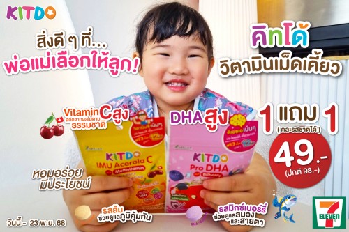 พิเศษสุด! “คิทโด้” 1 ซอง บรรจุ 12 เม็ด แถมฟรีอีก 3 เม็ด (แถมในซอง) รวมเป็น 15 เม็ด/ซอง จัดโปรโมชั่นสุดคุ้ม “ซื้อ 1 แถม 1” สามารถคละรสชาติได้ เพียง 49 บาท (จากปกติ 98 บาท) สมาชิก All Member ลดเพิ่มอีก 1 บาท เหลือเพียง 38 บาท ซื้อได้ตั้งแต่วันนี้ - 23 พฤศจิกายน 2568 ที่ ร้านเซเว่น อีเลฟเว่น ทุกสาขาทั่วประเทศ