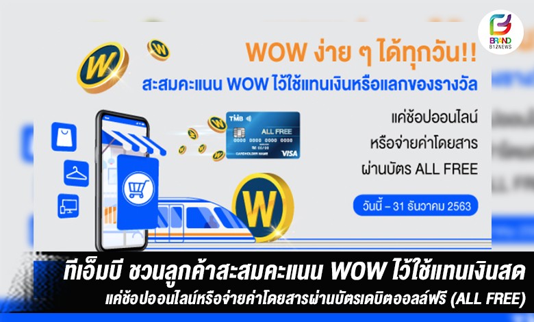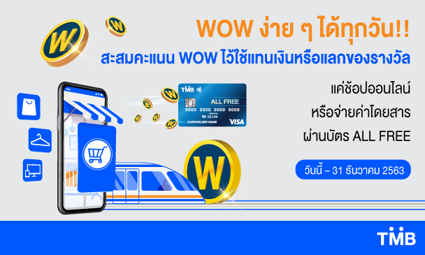 เพียงช้อปออนไลน์ หรือชำระค่าเดินทางของระบบขนส่งสาธารณะทั้งรถไฟฟ้า BTS, รถไฟฟ้า MRT, รถบัส และรถไฟ ผ่านบัตรเดบิตออลล์ฟรี (ALL FREE) รับทันทีคะแนนสะสม WOW สูงสุดถึง 150 WOW (มูลค่า 150 บาท) ต่อบัญชีต่อเดือน ตั้งแต่วันนี้ – 31 ธันวาคม2563