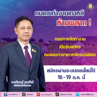 นายพิเชษฐ์ ทองพันธ์ อธิบดีกรมการจัดหางาน เปิดเผยว่า กรมการจัดหางานประกาศรับสมัครทดสอบภาษาเกาหลีกรณีพิเศษ (Special EPS-TOPIK) ครั้งที่ 29 สำหรับคนหางานที่เคยเดินทางไปทำงานในสาธารณรัฐเกาหลีอย่างถูกต้องตามกฎหมาย และเดินทางกลับตามกำหนดระยะเวลาการจ้างงาน โดยเป็นผู้ที่เดินทางกลับประเทศไทยตั้งแต่วันที่ 1 มกราคม 2553 เป็นต้นมา และมีความประสงค์จะเดินทางกลับเข้าไปทำงานในสาธารณรัฐเกาหลีอีกครั้งตามระบบ EPS ผู้สนใจสามารถยื่นใบสมัครได้ที่เว็บไซต์ toea.doe.go.th ได้ตั้งแต่วันที่ 16 - 19 ตุลาคม 2568 ตลอด 24 ชั่วโมง ไม่เว้นวันหยุดราชการ