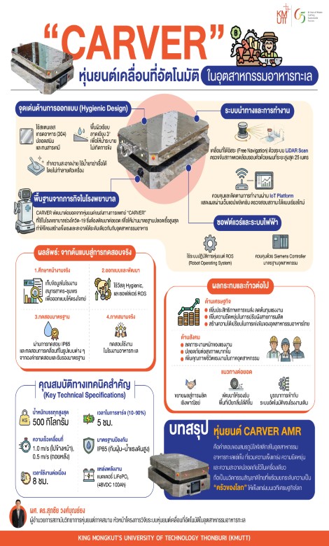 ผศ. ดร.สุภชัย วงศ์บุณย์ยง ผู้อำนวยการสถาบันวิทยาการหุ่นยนต์ภาคสนาม มหาวิทยาลัยเทคโนโลยีพระจอมเกล้าธนบุรี (มจธ.) ในฐานะหัวหน้าโครงการวิจัยระบบหุ่นยนต์เคลื่อนที่อัตโนมัติในอุตสาหกรรมอาหารทะเล เล่าว่า CARVER เป็นหุ่นยนต์เคลื่อนที่อัตโนมัติหรือ AMR ที่พัฒนาขึ้นระหว่างสถาบันวิทยาการหุ่นยนต์ภาคสนาม (FIBO) ผ่านความร่วมมือกับ BRAINWORKS IMAGINEERING CO., LTD. โดยได้รับการสนับสนุนทุนจากหน่วยบริหารและจัดการทุนด้านการเพิ่มความสามารถในการแข่งขันของประเทศ (บพข.) จุดเด่นของ CARVER คือการใช้เทคโนโลยี Free Navigation ที่อาศัยเซ็นเซอร์ LIDAR ในการสร้างแผนที่และระบุตำแหน่งของตัวเอง ทำให้หุ่นยนต์เคลื่อนที่ได้อย่างอิสระและชาญฉลาดโดยไม่ต้องพึ่งเส้นแม่เหล็กหรือ QR Code สำหรับรุ่นต้นแบบ CARVER-CLY-AMR-500 ออกแบบให้รองรับน้ำหนักบรรทุกสูงสุด 500 กิโลกรัม ความเร็วสูงสุด 1 เมตรต่อวินาทีเมื่อไม่มีน้ำหนักบรรทุก และ 0.50 เมตรต่อวินาทีเมื่อบรรทุกเต็มบนพื้นราบ ทำงานต่อเนื่องได้ 8 ชั่วโมงในกรณีไม่บรรทุก พร้อมระบบความปลอดภัย SICK Safety laser scanners และปุ่มหยุดฉุกเฉิน 4 จุด และรองรับการสื่อสารทั้ง Wi-Fi 2.4 และ 5 GHz รวมถึง Ethernet ทั้งหมดนี้เป็นผลจากกระบวนการออกแบบ เพื่อให้ CARVER ทำงานเป็นกำลังสำคัญในสายการผลิตได้จริง