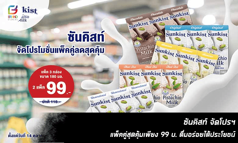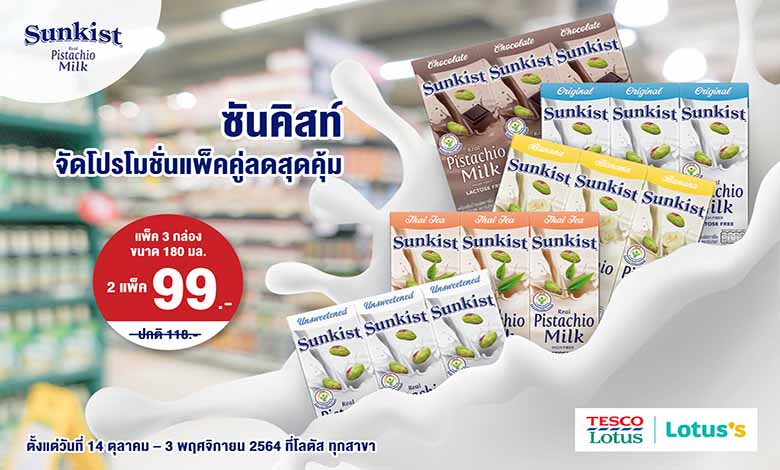 ซันคิสท์ แบรนด์ผลิตภัณฑ์ถั่วพิสทาชิโอ และเครื่องดื่มน้ำนมพิสทาชิโอ ภายใต้เครือเฮอริเทจ จัดโปรโมชั่นแพ็คคู่ลดสุดคุ้ม ดื่มอร่อยได้ประโยชน์ไปกับซันคิสท์ เครื่องดื่มน้ำนมพิสทาชิโอที่อุดมไปด้วยวิตามินอี โปรตีน แคลเซียม มีใยอาหารสูง ทั้ง 5 รสชาติ ได้แก่ สูตรไม่เติมน้ำตาล รสออริจินอล รสชาไทย รสช็อกโกแลต และนมพิสทาชิโอ ผสมเนื้อกล้วยบด ในขนาด 180 มิลลิลิตร (บรรจุ 3 กล่อง/แพ็ค) จากปกติ 2 แพ็ค