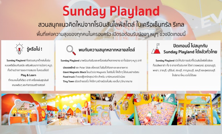 Sunday Playland คือธุรกิจภายใต้การดูแลของศูนย์การค้าโรบินสันไลฟ์สไตล์ ในเครือเซ็นทรัลรีเทล ปัจจุบันเปิดดำเนินการแล้ว 9 สาขาทั่วประเทศ ได้แก่ ราชพฤกษ์, สุวรรณภูมิ, พะเยา, ราชบุรี, บุรีรัมย์, สระบุรี, กาญจนบุรี, ชลบุรี และ สุพรรณบุรี พร้อมต้อนรับน้องๆ หนูๆ โดยเฉพาะช่วงปิดเทอมที่ใกล้จะถึงนี้