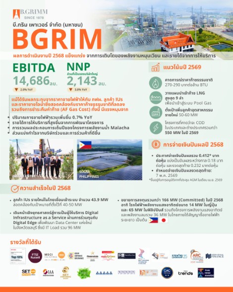 แนวโน้มเศรษฐกิจไทยในปี 2569 จากคาดการณ์ของธนาคารแห่งประเทศไทยเศรษฐกิจมีแนวโน้มขยายตัว 1.5% โดยมีแนวโน้มขยายตัวต่ำลงจากปี 2568 ตามการบริโภคภาคเอกชนที่ชะลอลงตามรายได้ และการส่งออกสินค้าที่ได้รับผลกระทบจากมาตรการทางภาษีของสหรัฐฯ ขณะที่ภาคการท่องเที่ยวทยอยฟื้นตัว สำหรับราคาก๊าซธรรมชาติของโรงไฟฟ้า SPP คาดการณ์ว่าจะอยู่ที่ 270-290 บาทต่อล้านบีทียู ซึ่งอยู่ในระดับที่ต่ำกว่าปี 2568 ที่ราคาก๊าซธรรมชาติอยู่ที่ 323 บาทต่อล้านบีทียู ทั้งนี้ บริษัทฯ วางแผนนำเข้า LNG ไม่เกิน 9 ลำ เพื่อนำเข้าสู่ระบบ Pool Gas และตั้งเป้าเพิ่มลูกค้า IUs รายใหม่ เชื่อมเข้าระบบรวม 50-60 เมกะวัตต์ โดยโครงการของ บี.กริม เพาเวอร์ ที่คาดว่าจะเริ่มดำเนินการเชิงพาณิชย์ (COD) มีดังนี้ โรงไฟฟ้าพลังงานแสงอาทิตย์ อินทรี บี.กริม กำลังผลิต 80 เมกะวัตต์ โรงไฟฟ้าพลังงานแสงอาทิตย์แบบติดตั้งบนหลังคา Zhongce Rubber นิคมอุตสาหกรรมอมตะซิตี้ จังหวัดระยอง กำลังผลิต 35 เมกะวัตต์ โรงไฟฟ้าพลังงานลมนอกชายฝั่ง Nakwol 1 กำลังผลิต 365 เมกะวัตต์ โรงไฟฟ้าพลังงานลมบนฝั่ง Huong Hoa 1 กำลังผลิต 48 เมกะวัตต์ และโครงการอื่น ๆ รวมกำลังการผลิตสูงสุด 30 เมกะวัตต์