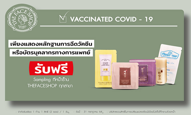 เดอะเฟสช็อป (THE FACE SHOP) ขอร่วมเป็นส่วนหนึ่งในการสนับสนุนการฉีดวัคซีนโควิด-19 และเชิญชวนให้คนไทยฉีดวัคซีนเพื่อสร้างภูมิคุ้มกันหมู่ เพื่อให้คนไทยทุกคนสามารถกลับมาใช้ชีวิตตามปกติได้โดยเร็ว โดยได้จัดแคมเปญมอบสิทธิพิเศษสำหรับผู้ที่ผ่านการฉีดวัคซีนป้องกันโควิด-19 เพียงแสดงบัตรรับรองการฉีดวัคซีน รับฟรีผลิตภัณฑ์ขนาดทดลองที่เหมาะกับสภาพผิว จำนวน 2 ชิ้น ต่อ 1 ท่าน พร้อมมอบสิทธิพิเศษเพื่อเป็นการขอบคุณและส่งต่อกำลังใจให้กับบุคลากรทางการแพทย์ไม่ว่าจะเป็น แพทย์ พยาบาล เจ้าหน้าที่ หรือพนักงานทางการแพทย์ ที่เป็นหน้าด่านเสียสละและทุ่มเทดูแลผู้ป่วยโควิด-19 เพียงแสดงบัตรประจำตัวเพื่อยืนยันสิทธิ์ ก็สามารถรับฟรีผลิตภัณฑ์ขนาดทดลองที่เหมาะกับสภาพผิว จำนวน 2 ชิ้น ต่อ 1 ท่าน ได้เช่นกัน