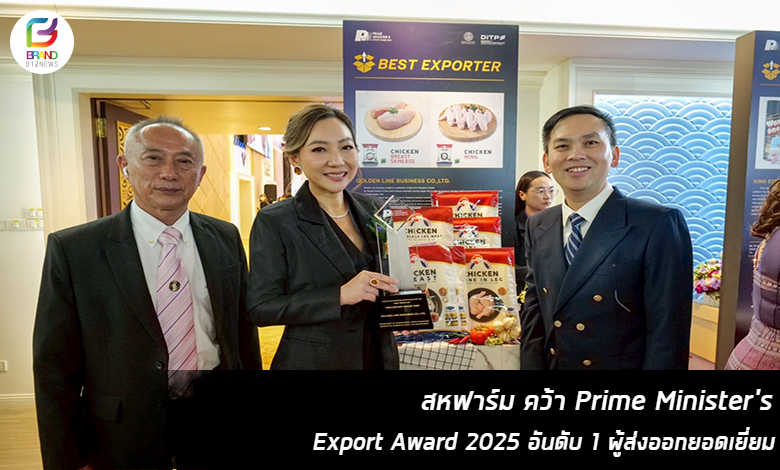 สหฟาร์ม ตอกย้ำความเป็นผู้นำธุรกิจอาหารครบวงจรของไทย โดยภายใต้การดำเนินงานของบริษัท โกลเด้น ไลน์ บิสซิเนส จำกัด สามารถคว้ารางวัล ผู้ประกอบธุรกิจส่งออกยอดเยี่ยม ประจำปี 2568 (Prime Minister’s Export Award 2025) ในพิธีมอบรางวัลซึ่งจัดขึ้น ณ ห้องบุรฉัตรไชยากร ชั้น 4 ตึกสำนักงานปลัดกระทรวงพาณิชย์