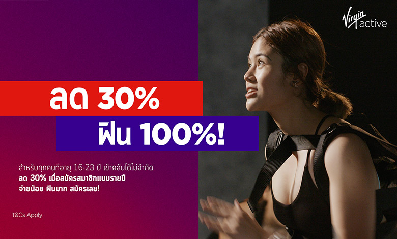 เวอร์จิ้น แอ็คทีฟ (Virgin Active) คลับออกกำลังกายระดับโลก ร่วมเป็นส่วนหนึ่งในการส่งเสริมให้วัยรุ่นและเยาวชนไทยมีสุขภาพแข็งแรง พร้อมผลักดันกระแสการออกกำลังกายในสังคมไทย โดยเสนอส่วนลดสุดพิเศษ 30% หรือสัปดาห์ละ 483* บาท สำหรับคนวัย Gen Z อายุตั้งแต่ 16 - 23 ปี ที่สมัครสมาชิกแบบ The Long Termer ตั้งแต่วันนี้ - ธันวาคม 2565 ซึ่งสมาชิกสามารถเข้าใช้คลับได้อย่างไม่จำกัด