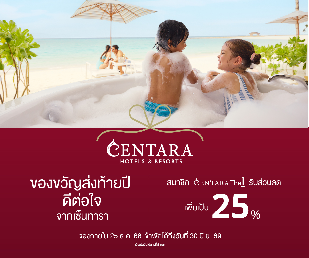 โรงแรมและรีสอร์ทในเครือเซ็นทารา เครือโรงแรมชั้นนำของประเทศไทย มอบของขวัญส่งท้ายปี ดีต่อใจ ด้วยข้อเสนอสุดพิเศษส่วนลดสูงสุดถึง 25% สำหรับสมาชิก CentaraThe1 พร้อมสิทธิประโยชน์สุดเอ็กซ์คลูซีฟอีกมากมาย ณ โรงแรมและรีสอร์ทในเครือเซ็นทาราที่ร่วมรายการทั่วไทย เอเชีย และตะวันออกกลาง เพื่อมอบช่วงเวลาแห่งความสุขแก่แขกผู้เข้าพักของเซ็นทาราตลอดเทศกาล