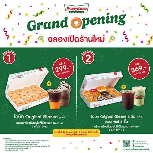 ดร.อุษณีย์ มหากิจศิริ ลีโอณีโอ ประธานบริษัท เคเอฟยู จำกัด ผู้นำเข้าอาหาร, เบเกอรี และช็อกโกแลตแบรนด์ดังจากทั่วโลก อาทิ คริสปี้ ครีม, ซินนาบอน, บูลโกกิ บราเธอร์ส, พาย เฟสซ์ และซีส์ แคนดีส์ ส่งท้ายไตรมาสแรกของปีด้วยกองทัพความอร่อยของโดนัทเนื้อนุ่มสูตรลิขสิทธิ์กับสาขาใหม่รูปแบบ Fresh Shop ณ โออาร์ สเปซ ศูนย์อาหารโรงพยาบาลธรรมศาสตร์เฉลิมพระเกียรติ ชั้น 1 ในวันเสาร์ที่ 28 มีนาคม 2569 ตั้งแต่เวลา 06.00 น. เป็นต้นไป พร้อมโปรโมชันที่แฟนคลับถูกใจ เพียงซื้อโดนัท Original Glazed 1 โหล จับคู่เครื่องดื่มเมนูใดก็ได้ในหมวด Over Ice 2 แก้ว ขนาด 12 ออนซ์ ในราคาพิเศษ 299 บาท (จากปกติ 409 บาท) หรือเลือก เซ็ต Assorted 1 โหล (Original Glazed 6 ชิ้น และ Assorted 6 ชิ้น) กับเครื่องดื่มในหมวด Over Ice 2 แก้ว ขนาด 12 ออนซ์ ในราคาพิเศษ 369 บาท (จากปกติ 475 บาท) ระหว่างวันที่ 28 มีนาคม 2569 - 3 เมษายน 2569 เฉพาะสาขานี้เท่านั้น !