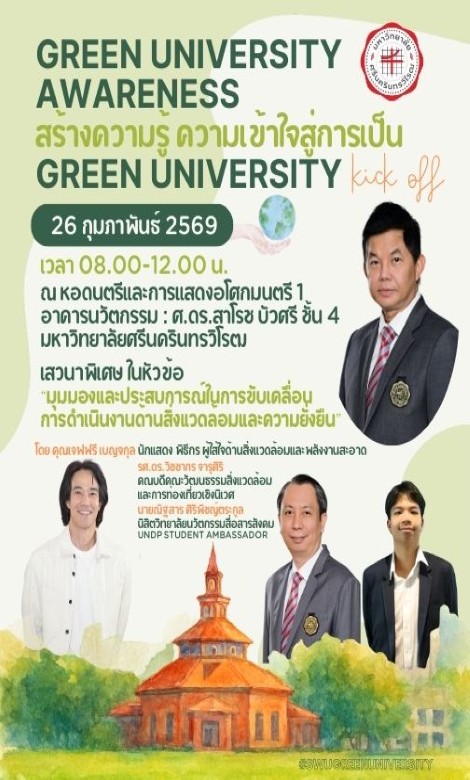 มหาวิทยาลัยศรีนครินทรวิโรฒ (มศว) มหาวิทยาลัยเพื่อสังคมยุคใหม่ใส่ใจสิ่งแวดล้อม ในแนวนโยบาย L O V E S ซึ่ง E ( Environment ) สื่อถึงการสร้างความรู้ ความเข้าใจสู่การเป็น Green University Awareness หรือ มหาวิทยาลัยสีเขียว (Green University) และปรับภูมิทัศน์ให้มหาวิทยาลัยเป็น Universal Design รวมถึง Health and Well- being areas เพื่อสุขภาวะที่ดีของคนในสังคมชุมชนโดยรอบ เช่น อโศกโมเดล – องครักษ์โมเดล เป็นต้น โดยล่าสุด มศว จะจัดโครงการ Green University Awareness : สร้างความรู้ความเข้าใจสู่การเป็น Green University (Kick Off) ในวันที่ 26 กุมภาพันธ์ 2569 เวลา 08.00-12.00 น. ณ หอดนตรีและการแสดงอโศกมนตรี 1 อาคารนวัตกรรม : ศ.ดร.สาโรช บัวศรี มศว ประสานมิตร กทม. เพื่อขับเคลื่อนนโยบายมหาวิทยาลัยสีเขียวอย่างเป็นรูปธรรม สร้างความตระหนักรู้ด้านสิ่งแวดล้อมแก่ประชาคมภายในและภายนอก โดยเปิดโอกาสให้บุคคลภายนอกที่สนใจเข้ารับฟังการเสวนาได้ฟรีโดยไม่มีค่าใช้จ่าย