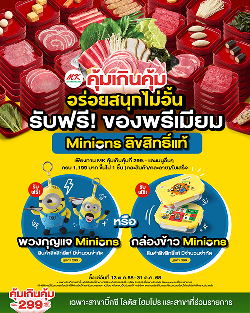 มินเนี่ยนตัวเหลืองสุดป่วน ยกขบวนมาสร้างสีสัน กับครั้งแรกของ MK บุฟเฟต์ คุ้มเกินคุ้ม 299 ที่พาคาแรคเตอร์ดังระดับโลกมาสร้างความสนุกให้เต็มอิ่ม! น้อง ๆ หนู ๆ ห้ามพลาดช่วงปิดเทอมนี้ ได้ทั้งอิ่มไม่อั้น พร้อมรับของพรีเมียมมินเนี่ยนลิขสิทธิ์แท้กลับบ้านแบบฟิน ๆ เลือกได้ทั้ง ตุ๊กตาพวงกุญแจ Minions (มูลค่า 299 บาท) หรือ กล่องข้าว Minions (มูลค่า 399 บาท) เพียงทาน MK คุ้มเกินคุ้ม 299 และเมนูอื่น ๆ ครบ 1,199 บาทขึ้นไป / ใบเสร็จ เลือกรับของพรีเมียมได้เลย 1 ชิ้น (คละสินค้า/คละลาย)/ ใบเสร็จ ตั้งแต่วันที่ 13 ตุลาคม 2568 – 31 ตุลาคม 2568 (หรือจนกว่าของจะหมด)
