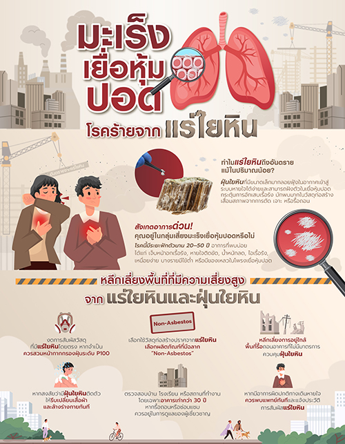 ในบรรดาโรคมะเร็งที่ร้ายแรงและพรากชีวิตผู้คนโดยไม่มีสัญญาณเตือนล่วงหน้า “มะเร็งเยื่อหุ้มปอด” ถือเป็นหนึ่งในโรคร้ายแรงที่ยากต่อการรักษาและมีอัตราการเสียชีวิตสูง ปัจจัยหลักที่นำไปสู่โรคร้ายนี้ คือการได้สัมผัสกับ “แร่ใยหิน” (Asbestos) อย่างไม่รู้ตัว แร่ใยหินเป็นเส้นใยแร่ธรรมชาติที่แบ่งออกเป็นหลายประเภท โดยเฉพาะกลุ่มแอมโฟไบล์ (Amosite, Crocidolite) ที่มีความเชื่อมโยงกับการเกิดมะเร็งเยื่อหุ้มปอดมากที่สุด เมื่อสูดดมเข้าไป ฝุ่นใยหิน จะติดอยู่ในเยื่อหุ้มปอด กระตุ้นการอักเสบเรื้อรัง และส่งผลให้เซลล์เกิดการกลายพันธุ์ ซึ่งอาจนำไปสู่การพัฒนาเป็นมะเร็งในระยะยาว
