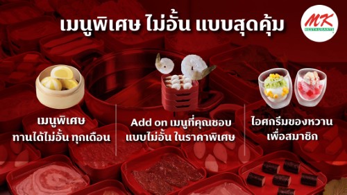 เมนูพิเศษ ไม่อั้น แบบสุดคุ้ม มีทั้งเมนูพิเศษของทานเล่น ซาลาเปาไส้ครีม แจกฟรีไม่อั้น! ตั้งแต่ 1-30 กันยายน 2568 และเตรียมพบเมนูเซอร์ไพรส์ที่มาย้ำความ “คุ้มเกินคุ้ม” ที่เรียกว่าเปลี่ยนใหม่ทุกเดือน! นอกจากนี้ยังมีเมนู Add on คุณภาพ ในราคาสุดคุ้ม กับเมนู กุ้งสด MK แบบไม่อั้น ตามที่ทุกคนเรียกร้อง และน้ำซุปครบรส มีให้เลือกเพิ่มถึง 3 รสชาติ ซุปหม่าล่า, ซุปน้ำดำสไตล์ญี่ปุ่น, ซุปต้มยำมันกุ้ง) รวมถึงยังมี น้ำจิ้มไม่อั้น 4 รสชาติ ฟรี (น้ำจิ้มสูตรต้นตำรับ, น้ำจิ้มเด็ก, น้ำจิ้มพอนสึ, น้ำจิ้มซีฟู้ด) และยังแลกซื้อไอศกรีมซันเด แค่เพียง 39 เท่านั้น