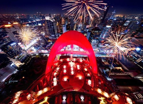 Centara Grand at CentralWorld คือแลนด์มาร์กอันโดดเด่นบนเส้นขอบฟ้าของกรุงเทพฯ โดดเด่นด้วยซุ้มโค้งสีแดงอันเป็นเอกลักษณ์ที่ประดับอยู่บนยอดตึก