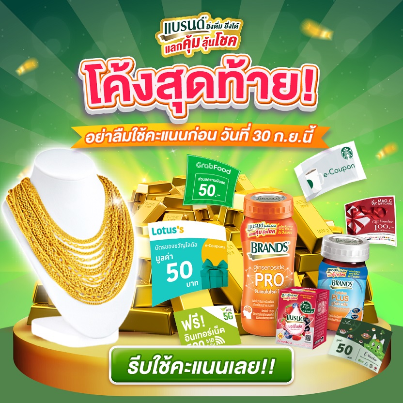 ร่วมลุ้นโชคโค้งสุดท้ายได้ง่ายๆ เพียงลงทะเบียนเป็นสมาชิกผ่าน Line Official Account @BrandsWorld สะสมคะแนน รับสิทธิ์ลุ้นทองทุกเดือน ถึงวันที่ 30 กันยายน 2565 พร้อมขยายระยะเวลาแลกของรางวัลจนถึง 14 ตุลาคม 2565