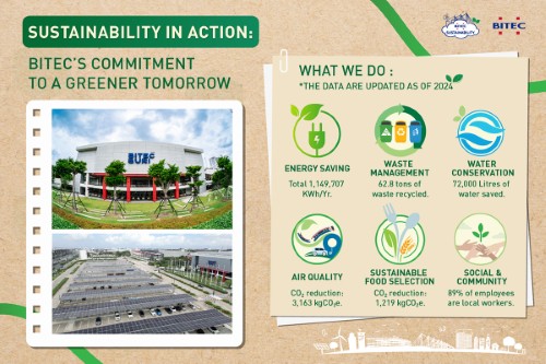 ไบเทคพร้อมเปิดพื้นที่ให้ผู้จัดงานและองค์กรต่าง ๆ เข้าร่วมเป็นส่วนหนึ่งของการขับเคลื่อนอุตสาหกรรมไมซ์ไทยสู่ความยั่งยืน ด้วยการมอบเครื่องมือและบริการต่าง ๆ แก่ผู้จัดงาน โดยผู้จัดงานจะได้รับบริการการติดตามคาร์บอนแบบเรียลไทม์ การบูรณาการการออฟเซ็ตในการวางแผนงานกิจกรรม การให้คำปรึกษาด้านการออกแบบงานกิจกรรมที่เป็นมิตรต่อสิ่งแวดล้อม และการให้การรับรองในฐานะผู้จัดงานที่ยั่งยืน ภายใต้แนวคิด “จัดงานให้ยั่งยืน เริ่มต้นได้จริงที่ไบเทค” สามารถติดตามโครงการดี ๆ ของศูนย์นิทรรศการและการประชุมไบเทค ได้ที่ Sustainability - Bangkok International Trade & Exhibition Centre หรือ www.bitec.co.th/visitor/sustainability